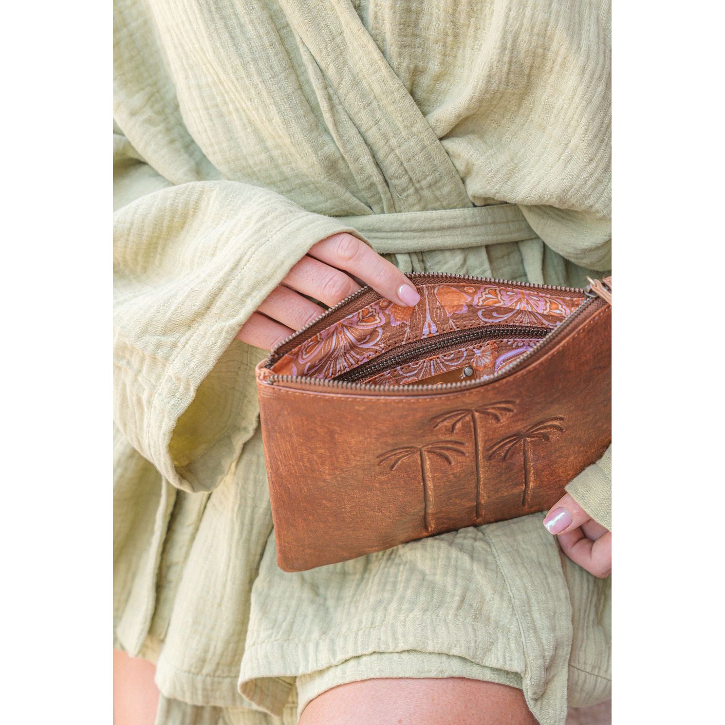 The Coco Palm clutch is perfect to grab and go. Lined inside with bohemian print fabric and features inside zip pocket and side card holders.
