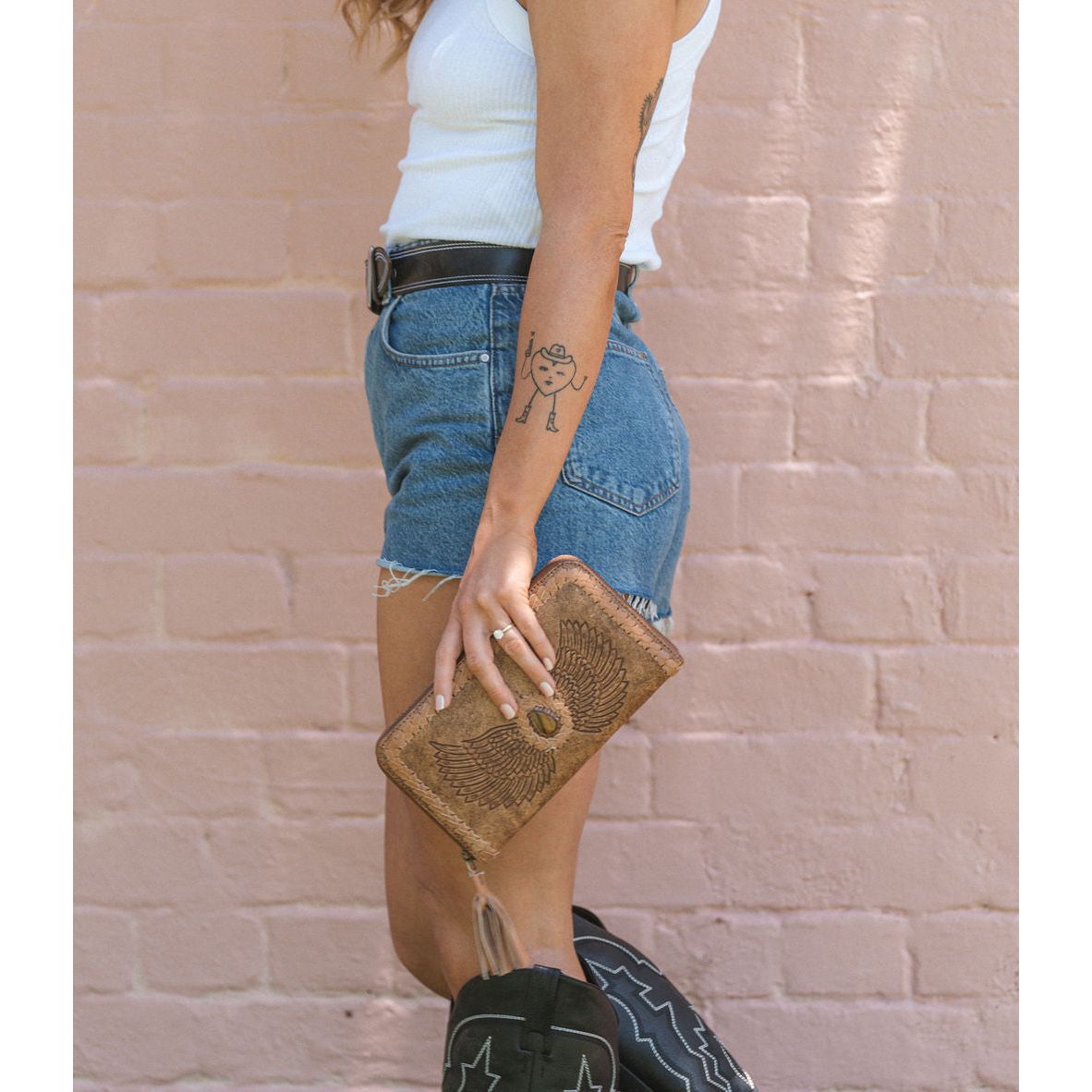 Beautifully tooled with Wild Wings and handcrafted from 100% leather in Brushed Antique Brown with Tigers Eye inlay, this bohemian beauty is stunning and so comfortable to carry.